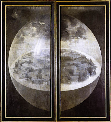 These are exterior panels that show the world during creation, probably on the Third Day, after the addition of plant life but before the appearance of animals and humans. These panels lack colour, probably because most Netherlandish triptych were thus painted, but possibly indicating that the painting reflects a time before the creation of the sun and moon, which were formed, according to Christian theology, to "give light to the earth". God, wearing a crown similar to a papal tiara is visible as a tiny figure at the upper left according to the art historian Hans Belting, "as though the world he had created was already slipping beyond his control".