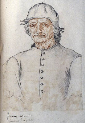 Hieronymus Bosch, in a c. 1550 copy of a drawing thought to be a self-portrait. His age in this representation (believed to be around 60 years) has been used to estimate his date of birth, although its attribution remains uncertain.